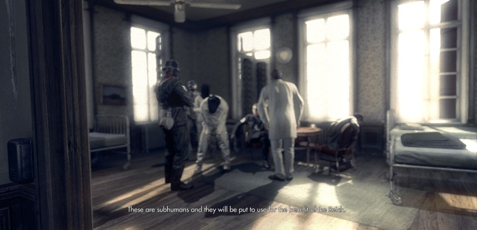 What’s interesting about New Order, then, is – well, there’s a few things. Firstly, the mentally ill patients are being looked after by genuinely nice caring doctors. They might not be well, but they’re getting better. And you see the doctors doing birthdays and Christmas with the patients – it’s actually really sweet. When the Nazis come, the patients are shackled and have black bags put over their heads – you can see the bags in the picture above. You see that removal of the face again when the Nazis start killing all the patients – they take the pillow out from under a patient’s head, put it over their face, and shoot them through the pillow. You see it two or three times, repeated – the pillow covers the face, and then they’re shot through the pillow. It’s just a really subtle way of dehumanizing the patients so that it’s easier for the Nazis to brutalise them. The patients are treated as human until the Nazis treat them otherwise. That’s a really strong political point about how we think about and portray mental illness. It shows how the act of stigmatizing the mentally ill is, well, kind of a Nazi thing to do. We know that the Nazis historically set about exterminating the mentally ill or physically disabled alongside Jews and Romani. The doctors here care for the mentally ill, and the Nazis dehumanize and kill them. That’s a criticism of Nazism as well as negative or stigmatizing depictions of mental illness in other games or media more generally.