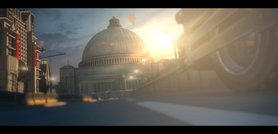 Note, however, that the third screenshot, in the header of this post, shows a very different building. I’ve reproduced a similar shot of that building here – it’s not from the same cutscene, but it’s the same building. You might notice that it’s got a very different design ethos. It’s neoclassical rather than brutalist, most obviously in the huge dome. This massive building is the Volkshalle, a building planned by Hitler and his chief architect, Albert Speer, but never built. When you first see it after opening the curtains in Berlin, it’s meant to indicate that, yeah, the Nazis definitely won, because here’s Speer’s hypothetical project made manifest. So we’ve got a clear split between neoclassical and brutalist architecture. There’s elements of the historical Nazi Germany (or at least what they historically planned) mixed in with brutalism, which Wolfenstein treats as shorthand for the Machine. It’s not really totally fair on brutalism, which already gets a bad rap, but that’s what the game does. Brutalist Machine is bad, natural human is good.