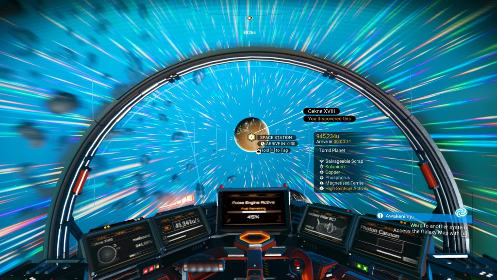 So here’s the question. With worlds and galaxies and an entire universe that’s all this big, what do you do? It’s less an existential question and more a practical one. Are you really going to spend two hours to get to that abandoned building, just to pick up some shitty nanites? Course not. But what about half an hour? Twenty minutes? Individual mileage will vary as to how long you’re willing to take, but at some point, everybody’s going to go right, fuck this, and fly up out of the atmosphere and zoom at high speeds to their destination. At some point, we all find the distance so unreasonably large that we’ll ratchet up the speed and truncate the time of travel. Two hours will become a minute and a half, and you’ll reach your destination, and you’ll collect your nanites, and you’ll fuck off somewhere new. In No Man’s Sky, space is something we tolerate. We tolerate it for as long as we derive pleasure from it, and then we put it aside and get to where we want to be.