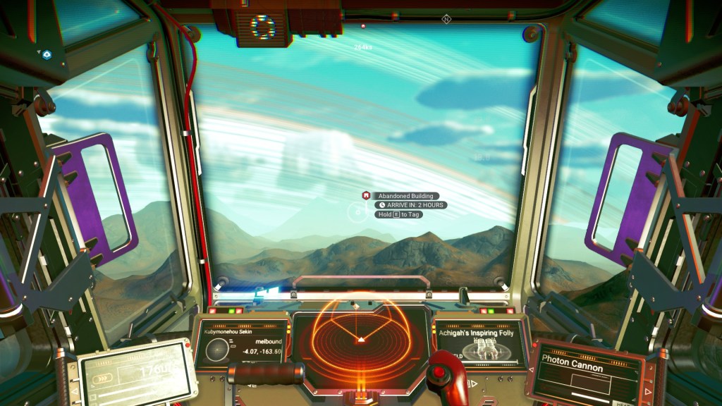 The first thing to know about No Man’s Sky is that it’s big. It’s too big. According to the game’s wiki, there are “255 unique galaxies, which in turn comprise around 3 to 4 billion regions, each of which contain more than 122 and up to hundreds of star systems. All star systems feature from 1-6 planets and moons, and usually a single space station.” Assuming the smallest of each of those figures, that’s – what, 3 billion times 122, assuming only one planet per system, which is obviously an underestimate – that’s 366,000,000,000 planets. Minimum. It’s somewhere between that and two trillion. And even an individual planet is pretty huge. In the image below, I’m in my spaceship, with my destination listed in the middle of the screen. It’s two hours away. That’s two real hours, two whole real-world hours, to get to that abandoned building. Fuck that. I mean – luckily, you know, if you get out of the planet’s atmosphere you can fly a lot faster, so at that point you just fly up and out of the atmosphere and quickly nip over the horizon. Takes maybe a couple minutes, tops.