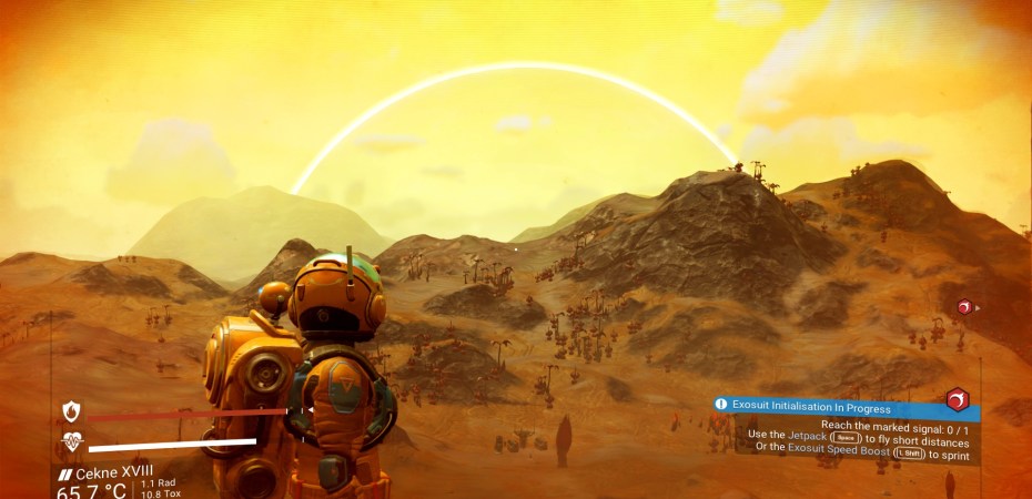 The first thing to know about No Man’s Sky is that it’s big. It’s too big. According to the game’s wiki, there are “255 unique galaxies, which in turn comprise around 3 to 4 billion regions, each of which contain more than 122 and up to hundreds of star systems. All star systems feature from 1-6 planets and moons, and usually a single space station.” Assuming the smallest of each of those figures, that’s – what, 3 billion times 122, assuming only one planet per system, which is obviously an underestimate – that’s 366,000,000,000 planets. Minimum. It’s somewhere between that and two trillion. And even an individual planet is pretty huge. In the image below, I’m in my spaceship, with my destination listed in the middle of the screen. It’s two hours away. That’s two real hours, two whole real-world hours, to get to that abandoned building. Fuck that. I mean – luckily, you know, if you get out of the planet’s atmosphere you can fly a lot faster, so at that point you just fly up and out of the atmosphere and quickly nip over the horizon. Takes maybe a couple minutes, tops.