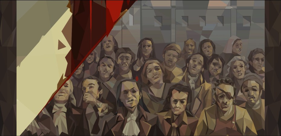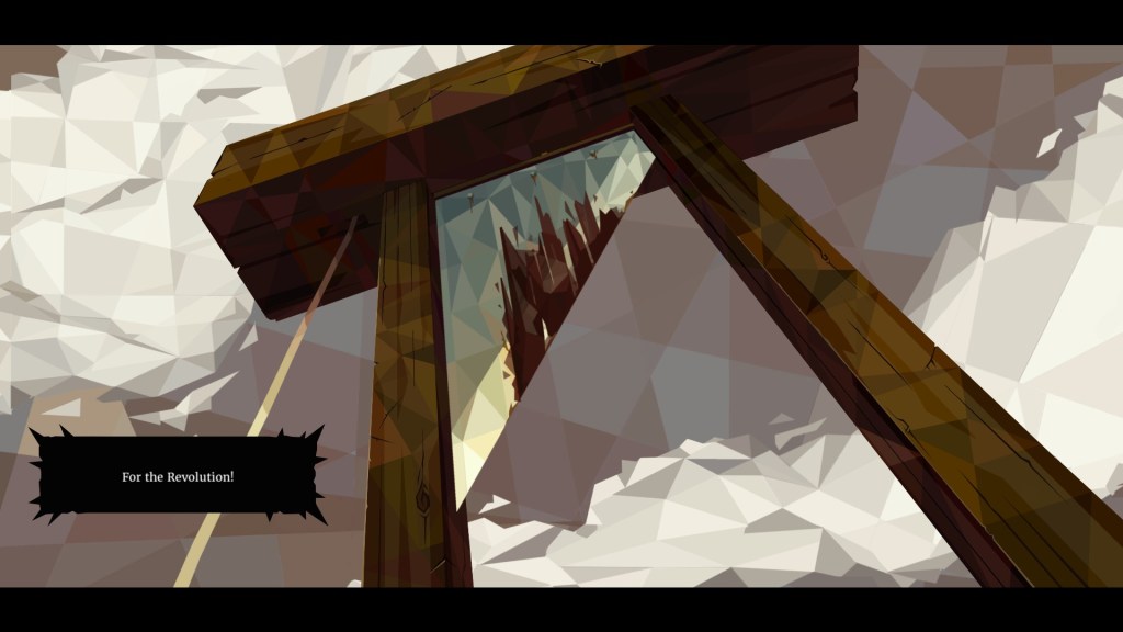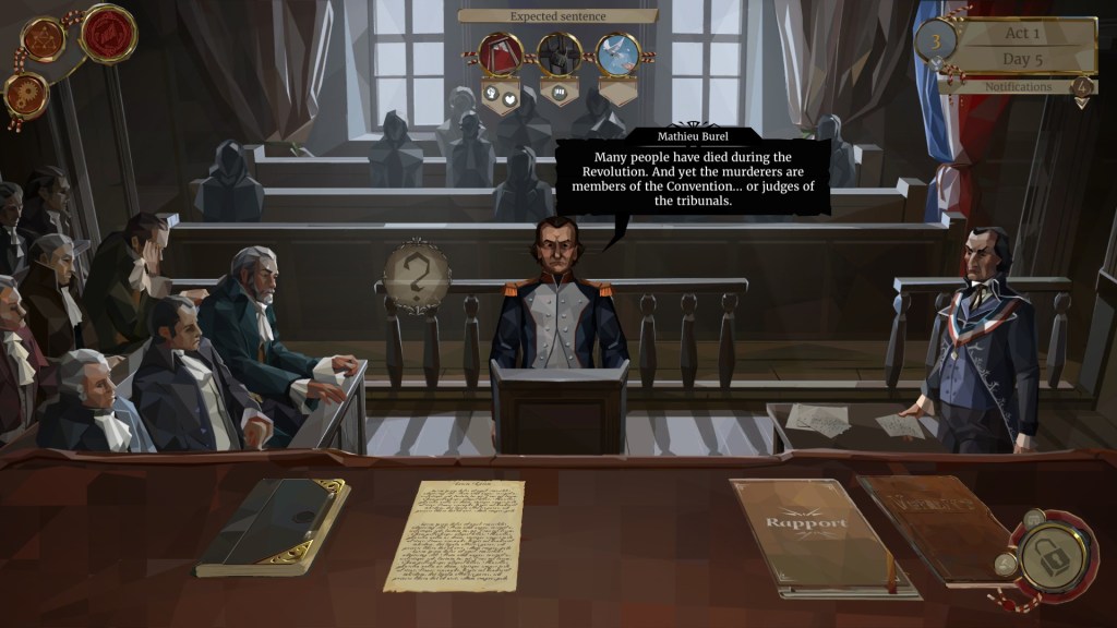Ah, I’m excited about this, I’ve been wanting to write more around genre in video games for a while. We. The Revolution is a 2019 game where you play a judge on the Revolutionary Tribunal, which was the court established during the French Revolution. In terms of setup, it’s very similar to Papers, Please: you’re a government official under an unstable regime, and you make decisions based on the pragmatics of survival rather than from any high-flying ideas about truth or justice. Both games are about hypocrisy, where you live among the trappings of powerful cultural symbols (such as justice) but see none of what they purport to represent. They are hollow and inauthentic, made into mockeries by a corrupted government.