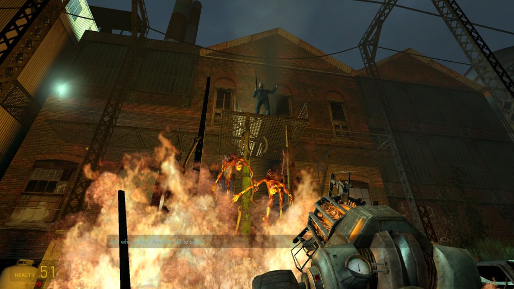 So you can see the classic Gothic arc here. Half-Life 2 is a game about science and enlightenment, and you descend into an abandoned ruined town, where you encounter a spectre of the dark, irrational past. It would be easy to say that religion is the spectre and end the conversation, but I don’t know that it’s so simple. It’s true that Ravenholm is where we get the clearest and most sustained references to religion. The level uses religious imagery and ideas to heighten the sense of Something Evil From The Past. And yet Grigori, who embodies that religious spirit, is not a villain. He’s not Dracula. It’s implied that he’s insane (“although they call me crazy, I care not, for thou art my helper”), but he’s also kind of a badass. Father Grigori fucks shit up. He’s like this cool Old Testament motherfucker. Half-Life revels in its depiction of Grigori even as it’s clearly uncomfortable with some of the implications of his worldview. He’s awesome, but he’s also not the future. He’s suffered through this awful place, and arguably has lost something as a result. He’s reverted to a pre-scientific language in order to find meaning and offer some sort of closure to the people he used to live with. You experience the horror that caused him to revert in such a way – so you can appreciate what he’s feeling – but it doesn’t consume you like it does him. That is, while he’s maybe not entirely correct, the game doesn’t say he’s totally wrong either.