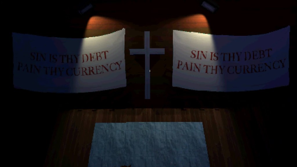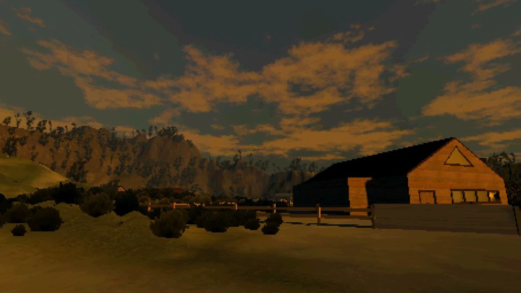 Sagebrush is a 2018 game about exploring the empty ranch of a religious cult. The cult is all dead via mass suicide, and you’re poking around and piecing things together. For the bulk of the game, to be honest, I wasn’t that impressed. It felt like a combination of a dozen different cult tropes that you’ve already seen. The developer’s website says that the game was based on extensive research into real cults, which makes sense – it feels stitched together from the highlight reel of other stories. There’s a charismatic leader with a divine revelation, lots of manual labour, an emphasis on punishment, suffering, and the sinfulness of the outside world, guns and a loose militia to defend the compound, sexual abuse, FBI investigators, and eventually a group suicide event, where they lock themselves in the chapel, drink sleepy medicine, and burn the chapel down around them. You learn about the plot through diary entries and the detritus scattered around the compound, and for the most part I don’t really have anything to say about it. I actually wasn’t planning on writing anything about this game – it didn’t have anything that I felt particularly compelled by. But then I hit the ending.