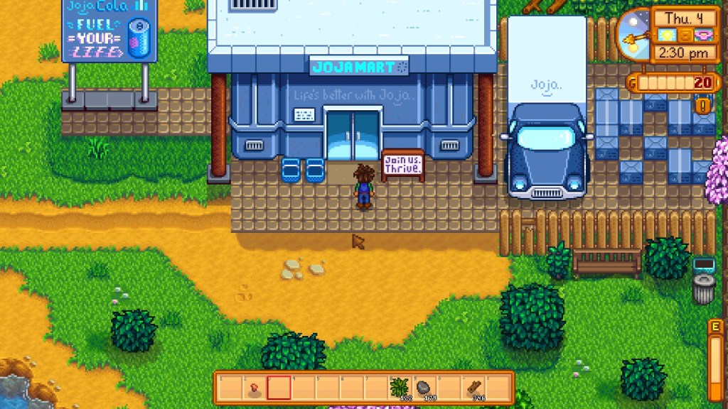 To be clear, I’m not arguing that Joja Corp are secretly good. The point is that in Stardew Valley, both JojaMart and Pierre’s General Store are important to the actual structure of Pelican Town’s food production, and you’re not. It’s easy to hate JojaMart as the evil corporate baddies, but the tension of Stardew Valley is that your easy, consequence-free food production fantasy, your status as surplus farm LARPer, depends on the very efficient functioning of companies like Joja. You can hate them all you like, but they create the conditions for the fantasy you’re enjoying – both within the fiction and without. They’re the reason why you’re not responsible for food production, why you’re not out working on a farm with actual lives at stake – again, both inside the fiction and out of it.