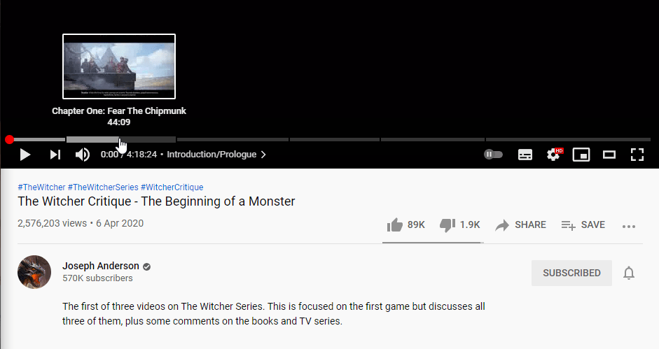 Let me try and outline the difference between the two forms, at least as I see it. These terms are inappropriate for a bunch of technical reasons, but as a gesture towards what we’re talking about, we might say that for the audience, watching a video is a passive, temporal experience, while reading an essay is an active, spatial experience. These – again, they’re inappropriate terms, but they can maybe initially set us on the right track. With a written essay, it’s organised spatially on a page. Even with the digital page of this article, it’s spatial – the previous paragraph is up there, and the next paragraph is down below. That’s a spatial organisation. Text runs from left to right, from top to bottom. Ideas are organised into paragraphs, which are divided by a separating line (and sometimes a picture if you’re lucky). By contrast, videos are organised temporally. There’s one single space, the video screen, where images and sound come and go in a strict temporal arrangement. In Joseph Anderson’s four hour video on The Witcher, the first twenty minutes are introduction, and then minutes twenty through sixty-five are the first phase or chapter of the argument, titled ‘Fear The Chipmunk’. These different forms lead to the active or passive nature of your engagement. When you’re watching a video, to some extent you have to just sit there and listen to the person speaking. You have to wait for them to finish what they’re saying. With reading – for me at least, I always feel like I can attack a written text. You skim, you skip, you re-read – and the spatial organisation makes it so easy to navigate your way through the text with a fluidity and speed that just doesn’t exist with a video.