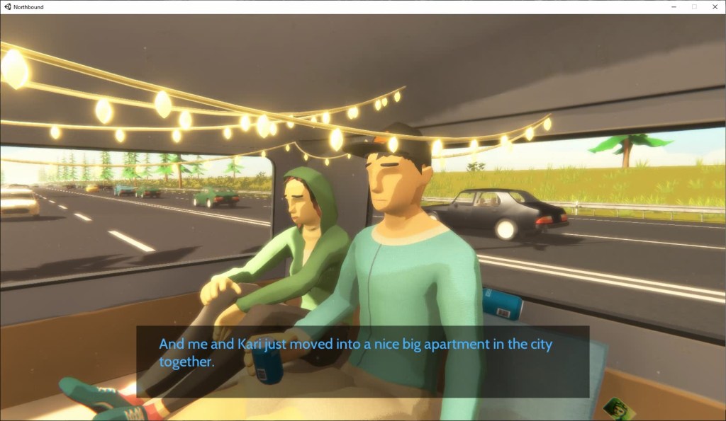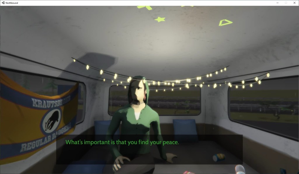 And let’s be really explicit here about what’s going on. At the start of the game, the characters in the van are excited to go out on this trip. They’ve surrounded themselves with the paraphernalia of their glorious student days, and everything is grand. Over time, we learn that the characters just aren’t those people any more. They aren’t eighteen. They’ve outgrown that juvenile stage, but they’re still stuck in the same van. The environment doesn’t match their growing comprehension of their own mental state, and it’s excruciating. It makes you itchy, it makes you want to crawl out of your own skin – because you see these people just becoming increasingly aware of how inappropriate their surroundings are. In Northbound, the meaning of the environment changes as the player becomes more aware of what’s going on. The markers of joy – the stars on the ceiling, the sports team flag, the little string of LED lights – become bitter, taunting reminders of a state that no longer exists. And there’s no privacy, either. It’s just three friends (and one semi-unwelcome girlfriend) stuck in a cramped, tiny little van, surrounded by the detritus of their previous lives and lapsed relationships. It’s beautiful.