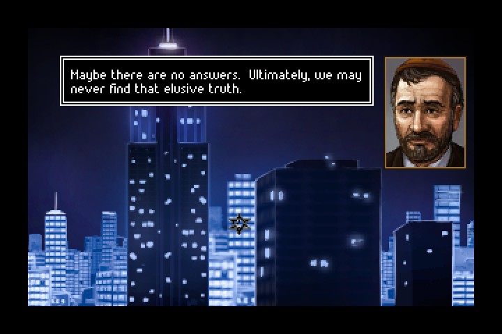 You can also see this process play out in more traditional detective narratives. There’s a convergence between the systems-driven processes of the game and the scientific method of inquiry. They both share this idea that the world makes sense, that it can be contained within logical, rational rules, and that by configuring our behaviour and actions according to these rules, we can come to an objective conclusion as to the identity of a criminal. The win/loss structure of video games even confirms your conclusions beyond a shadow of a doubt – you’re told very objectively whether you got it right or wrong. In the 2013 point and click murder mystery The Shivah, you can win or lose depending on your actions. You’ll be told if you get it wrong. The Shivah is a game about asking questions – it ends with a monologue about how “we may never find that elusive truth” – but also, by that point, you’ve won the game. You’ve found the correct answer. You’ve caught the murderer. There’s a level of tension here between the fictional motif of uncertainty, of questioning, and the unambiguous, absolute win/loss conditions built into the structure of the video game form.