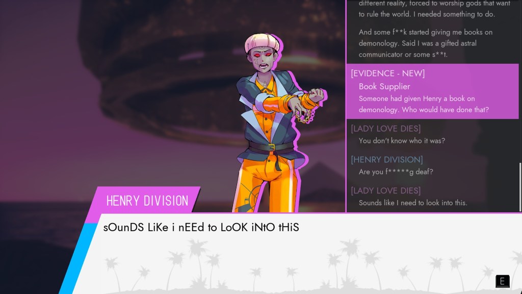 Let’s maybe back up a minute, start from the start. Paradise Killer is a fantastic 2020 murder mystery game. It’s got amazing world-building, it’s intriguing, it’s sexy and fun – it’s just wonderful. The council of Paradise Island are murdered, and you, as the investigator Lady Love Dies, must figure out who did it. From the beginning, Paradise Killer is a game about stories of guilt and justice. Everyone believes the murderer to be the prisoner Henry, a man possessed by a demon. On the night of the murder, he broke free, and was found outside the council chambers with council member blood in his guts. But the facts don’t quite add up. For one, he simply didn’t have time to make it all the way from his cell up to the council chambers – not in the handful of minutes between his escape and his recapture. The math doesn’t add up. Clearly, someone is selling you a story. And you can buy it, by the way. You can condemn Henry to death and swan off into the sunset. The game won’t give you the ‘bad ending’, some cutscene where you’re told off for leaving the problem unresolved. Instead, it pushes the value judgements of right and wrong outside of the game structure, making them something for you to wrestle with as a player.