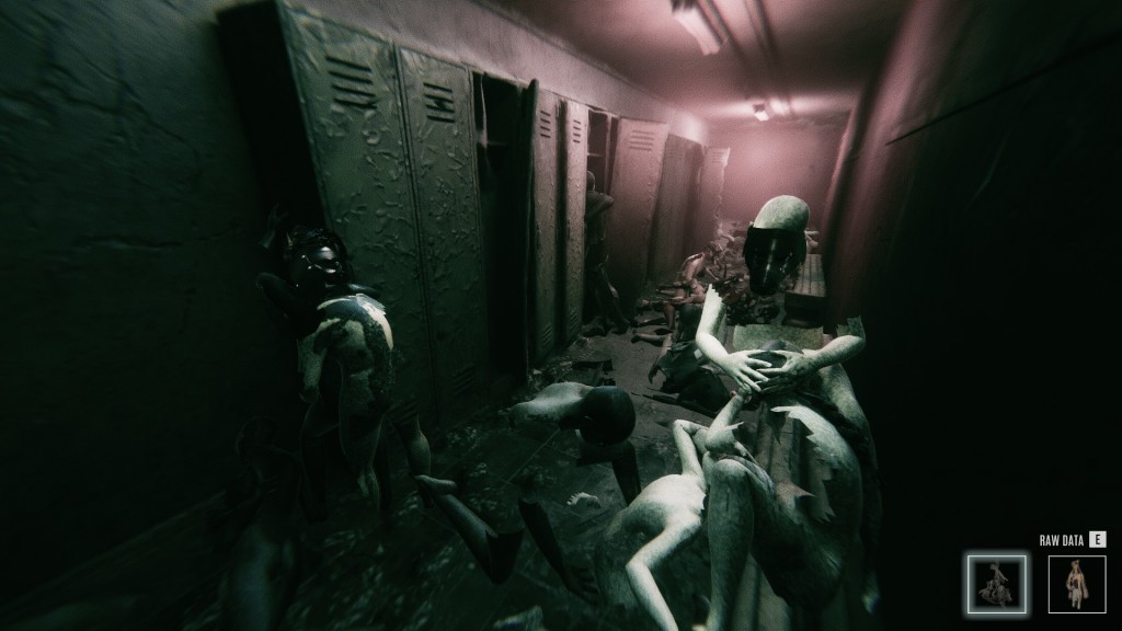 Probably one of the more potent sequences for this abstract, distorted visual approach is near the end of the game – in a sex club called ‘Kinkheaven’. The club uses a lot of obscured vision, showing sexual scenes through blocked doors, half-drawn curtains, or through cracks in the wall. The locker room scene above can only be viewed obliquely, by looking sideways through a doorway that you otherwise can’t enter. Characters are also often only half-depicted, with parts of their bodies left unrendered. In the image above, for instance, the gas mask man on the right is missing the upper half of his torso, from his upper stomach to his shoulders. The kneeling figure in the center of the frame is missing most of the middle of their body, and the masked figure on the left seems to end at the knees. All of this contributes to an atmosphere that is more readily evoking sexuality than directly depicting it.