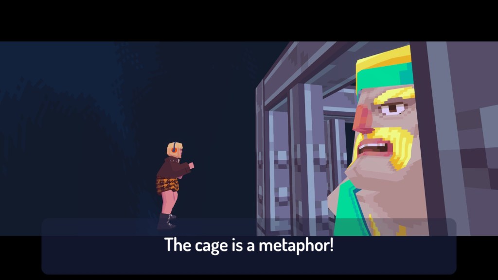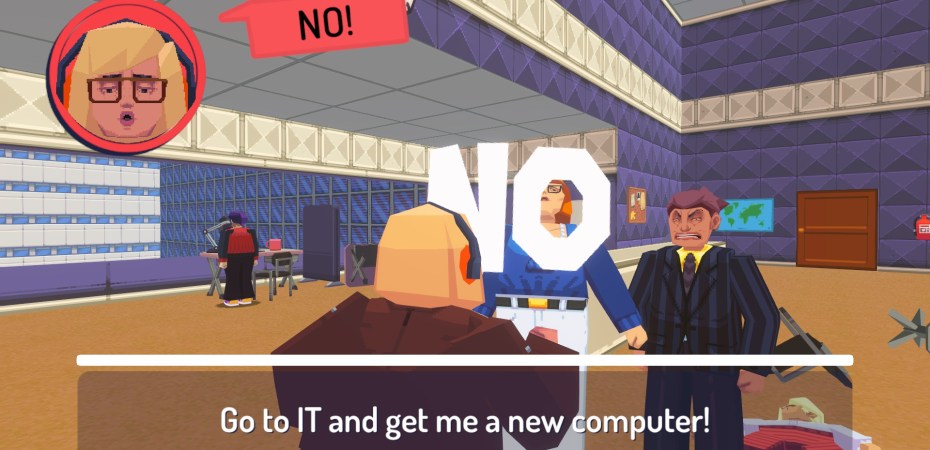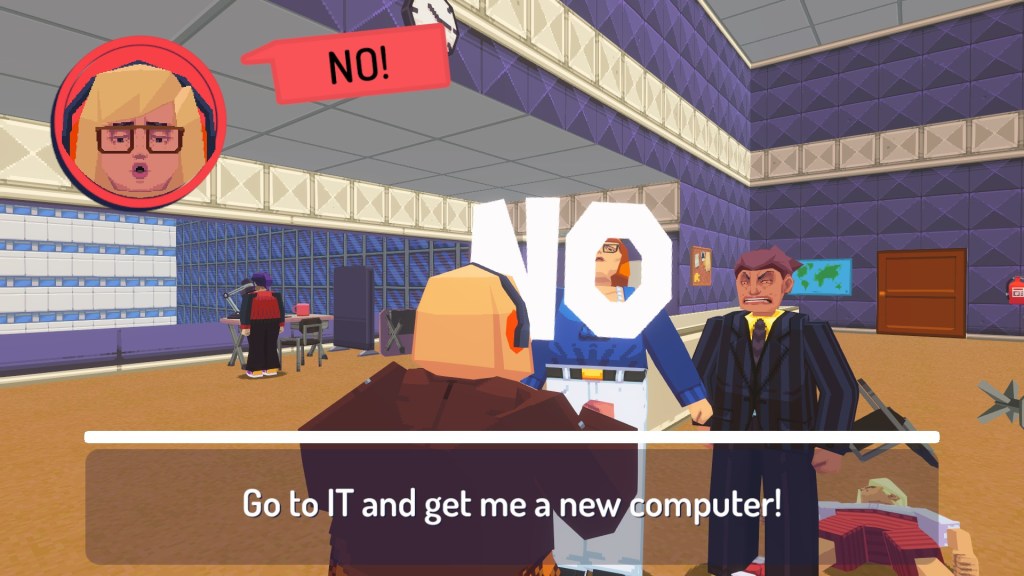 It’s a delight, then, to have recently encountered Say No! More, a 2021 game from German indie developers Studio Fizbin. Say No! More is a game where you run around an office shouting ‘No!’ at your stupid workmates whenever they ask you to do something. You start the game as an intern, and everyone tries to take advantage of you, and you shout at them and they run away crying. Each new level has you confront the next person up the corporate ladder, until you’re bellowing refusals at the CEO. There’s also a subplot about a staring contest. From our two options above, Say No! More clearly picks the first. It’s a cathartic protest game, similar in tone (although obviously not content) to Tonight We Riot or arguably even the recent Wolfenstein reboot. It’s a vehicle for venting your rage at the system – you can power up your No’s and send office equipment flying, blasting down dividers and hurling desks and paperwork across the building. It’s a power fantasy, again like Tonight We Riot and Wolfenstein – it’s a politically loaded power fantasy where we break free of corporate capitalism and our fortnightly pay. Like those other games, it has revolutionary appeal – it encourages us to participate enthusiastically in a vision of a new world, and maybe in some sense realise that world by acting it out in the digital realm.