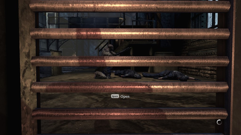 There are two stand-out moments here in the game’s first building, both arguably relating more to gameplay information than to pure cinematic drama. As you rock up to the end of an early air duct, you see through the grill a guard backing away from some inmates. He’s begging for his life, and they shoot him down. It’s short, and not as elegant as the Arkham City moment, but it’s an effective method of communicating information. It shows you the bad guys and warns you not to run out in front of them. It establishes threat really neatly. Similarly, the very next room after those rioters is where you play your first Predator challenge – essentially a stealth challenge where you have to sneak around and knock out guys with guns. Asylum uses its air duct trick again to introduce the threat: as you come round a corner and get close to the end of the duct, you can see an inmate on the other side picking up a gun off the corpse of a security guard (above). Again, the game knows where you’re going to be looking, and it uses that knowledge to show you things that affect how you play.