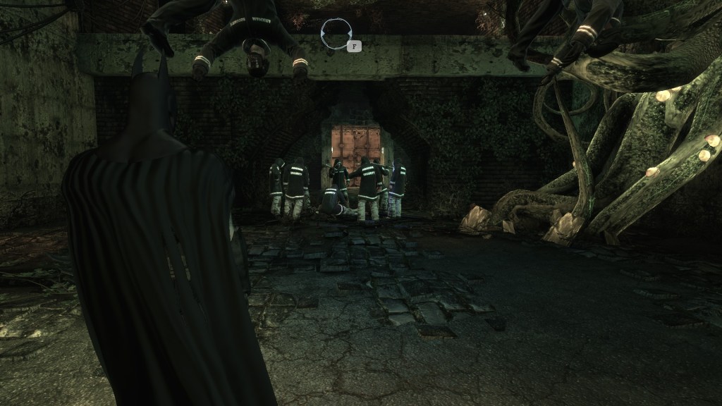 These are pretty well-known sequences, and the broader community has discussed them at length – but I think what’s interesting here is how they tie into the question of sight. With Arkham Asylum, it’s easy to feel like you’re in control. It’s a power fantasy, and it takes the time to make you feel in control. You find yourself learning elements of gameplay quite naturally, just by virtue of your moving through the game. The Scarecrow sequences offset that sense of security. They happen just often enough to keep you questioning what you’re seeing. And that edge, that tendency to interrogate what’s in front of you – it’s something the game rewards. There are tangible rewards in the collectibles and challenge maps unlocked by finding Riddler’s trophies, but there are also little subtle things that can be pretty satisfying too. In the Medical Facility, when you go to save Chen, there are bad guys hiding on a platform above you. You can see one of them hiding over Batman’s shoulder during a cutscene. When you first enter the room, they’re not immediately visible, but you can use your Detective Vision and spot them lying in wait. Similarly, near the end of the game, one of the transition areas features a group of Arkham guards clustered around an unconscious inmate. When you get close – surprise! They’re actually Joker’s thugs. Again, it’s not huge, but you can see this little twist coming if you scan them with your Detective Vision (the third image in the gallery above). If you bother to look, you’ll know ahead of time: these guys are hostile.