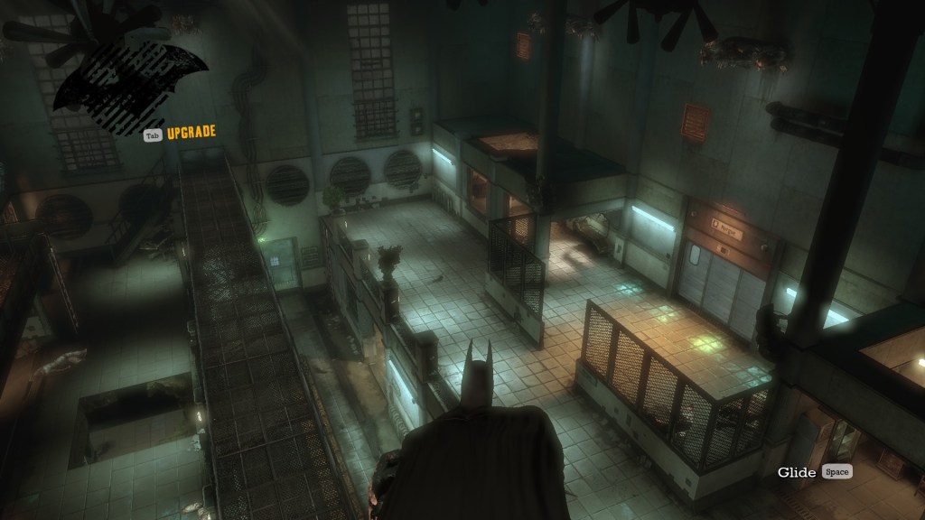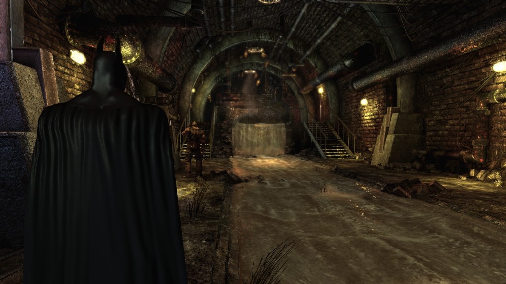 We were talking recently about sight in Arkham Asylum, and I said that we were working up to a bit more of a long haul through some of the visual design of the Arkham games. Architecture and visual design can be slippery to talk about – because we’re not just discussing the elements in themselves, right, it’s how they sit in context. So, for instance, both Arkham Asylum and its sequel, Arkham City, deploy this specific brown brick material – but they use it to totally different effect. In Arkham Asylum (the first image below), brown brick indicates dilapidation. It’s associated with the sewers – it’s the asylum’s inherent moral corruption made manifest. It tells us that the whole place is rotting from the inside. In Arkham City, brown brick is more often used to signify poverty. In the center of that second image, you can see this burnished brown brick building – the one with two rooms lit on the wall facing us, and a third lit room round the corner. It’s built out of the same material – and it’s obviously aged and weathered, but it’s noble. There’s none of the sense of rot. Instead, you have (on the rooftop in front, center bottom) this corrugated iron lean-to established against the building’s side. It might be hard to make out, but in the lean-to there’s a mattress, and a couple of shelves – someone lives there. The brown brick in that instance much more readily speaks to wealth and poverty. It comments on the gap between mainstream society, who live within permanent, established infrastructure, and the disenfranchised, who build temporary, make-shift shelters adjacent to that social infrastructure without ever being granted access to its protections. Same basic building material, totally different meaning.