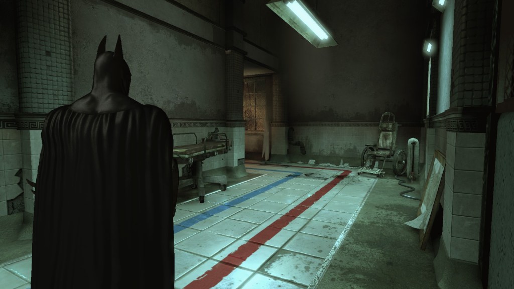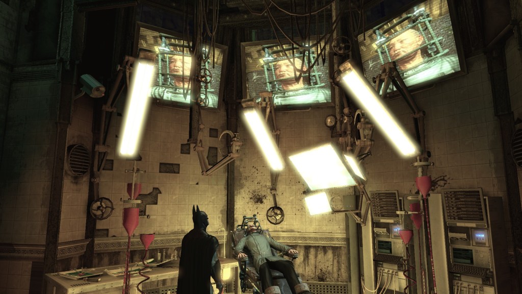 The tiles, then, represent an attempted incursion into this subterranean space. To take the setting at face value, Arkham Asylum is a place where doctors try to cure the violent insanity of Gotham’s supervillains. The tiles evoke the sanitary, the sterile. They make you think of hospitals – again, in practice, the idea with tiles is that they’re meant to be easy to clean. In a psychological context, they suggest a calm, clear environment, wiped clean of the clutter and noise of the world. They offer refuge from the outside, a hygienic environment in which to rebuild these supposedly shattered psyches. And yet the tiles in the asylum are never clean. They’re always stained or bloodied, or chipped away and broken. On a visual level, that staining is ambiguous. Does it come from the villains, from the bile they traipse around everywhere, or is it caused by the doctors’ fumbling interventions? To speak metaphorically, we might ask: were the villains already bleeding, or are the doctors cutting into them? Is it an existing wound or poorly managed surgery? This game has a deep ambivalence about attempts to carve into the psyche – as we’ve discussed with Bane, the doctors arguably aren’t part of the solution. Scarecrow himself – Doctor Jonathan Crane – manifests the game’s fear of medicalisation. You first meet him – or his gas – in a cutscene that looks into an operating theatre, where orderlies and patients scream in fear, including one with his eyes held open by specula in a reference to A Clockwork Orange. The game knows that something is repressed, but it’s really not certain about the role of medicine in rooting it out. The medical or psychological venture is portrayed as something forced upon patients, often to their detriment. The tiles articulate that tension: they promise safety and undermine that promise in the same breath.