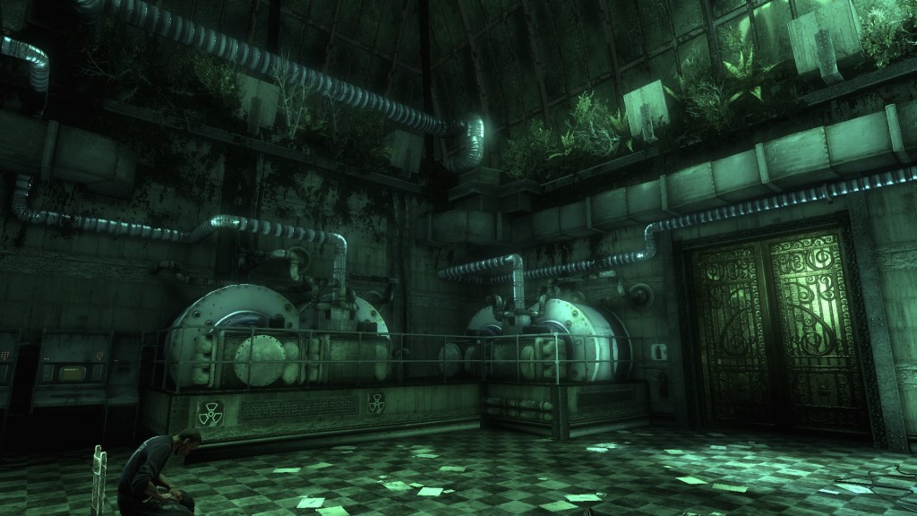 And there are plenty of other examples that we could draw out. The Scarecrow sequences (which we talked about previously) are obviously a major location for negotiating repression and self-control. Poison Ivy is part of a narrative about the dangers of unrepressed female sexuality – standard Batman fare, but still gross. Rather than itemizing every instance of repression, though, in all their variations, let’s consider how the theme is explored through architecture. For my money, there are maybe three or four key visual elements in Arkham Asylum. There are those iconic filthy tiles, which you see in the hospital wing and elsewhere; the brown brick of the sewers; and the patina green of rusted metal, which is probably most prominent in the gardens. There are plenty of additional locations that could be considered iconic (what about the Mansion, with its Castlevania clocktower? what about Croc’s elevator in the opening sequence?), but I’m not contesting key locations. I’m talking about the textures or materials that play a repeating visual role across the asylum. At just about every moment throughout the game, you can find some combination of these elements. They’re concentrated around those key areas – the hospital, the sewers, and the gardens – but they can be found just about anywhere. The first three images below show them in their concentrated form, and the second set of three show them in different combinations in different environments. Brown brick makes up much of the exterior of the buildings, as seen outside Intensive Treatment. A heavily stained variation on the tiles can be seen in the first gameplay area, where Joker first escapes, and that same green tinge – even when not attached to specific instances of rust or oxidation – pervades areas like the Medical Facility. You can see how we’re stretching our definitions a little here – strictly speaking these aren’t all the same exact materials. But I think we can treat them as dominant visual principles, as dominant aspects of the colour palette as well as key textures throughout the asylum.