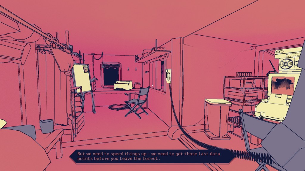 We might hesitate over whether NUTS sees this surveillance gap as a historical accident, as a current but not permanent limit. As the game proceeds, you are able to access additional cameras – surely implying that the squirrel panopticon looms just over the horizon. Further, the game is set in a pre-digital age. You receive instructions via fax; your video cameras use cassette tapes and need to be played back through televisions that you store in your caravan. Have we not overcome these issues? Are they not in some sense made redundant by the advent of digital technology? NUTS’ concern with old-fashioned devices reveals an interest in the material nature of surveillance. Your ability to monitor the squirrels is governed and in many cases impeded by the materiality of your gear. Tapes must be rewound, paused, played back. When you find a squirrel’s stash, you twiddle a dial to link the correct monitor to the printer so that you can print and then fax the image back to home base. At the same time, NUTS is a video game. There is no fax machine except as modelled by the game. There are no cameras except as modelled by the game. The limits of these technologies do not belong to the past: they are modelled and contained within the contemporary computer system. They equally belong to the modern day. The player explores NUTS through a doubled interface, through a screen depicting other screens. NUTS uses that doubling to explore contemporary limits of surveillance, which, it suggests, are of a kind with the issues of the past.