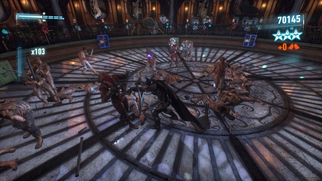 So then: the Iceberg Lounge. As I said, it’s an endless combat map. Enemies will spawn, and you fight until you drop. Your goal is to reach a high score. Different types of actions are scored in different ways: a basic punch is ten points, and a counter is twenty. You also receive a multiplier for each action ‘chained’ together. If you punch one guy and then counter someone else, the multiplier will tick up. If you get hit, or if you take too long (more than about a second), the multiplier drops. This multiplier is obviously the key to your score: if you’re only making individual punches, you’ll have to punch a hundred thousand times to get to a million points. By contrast, if you have a multiplier of, say, 300, each punch is worth 3,000 points and each counter 6,000. So there are two reasons to avoid damage: obviously if you take too much damage you’ll die, but a hit also resets your score multiplier. It takes time to build back up to a multiplier where you’re making a meaningful number of points. That’s extra time where you’re at risk of further mistakes and ultimately at risk of a game over.