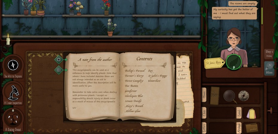Strange Horticulture is, I think, quite special, because it obscures the function and purpose of the things you collect. You can have a couple dozen plants on your shelf, and you might only know what half of them are called. Having the physical thing in your possession doesn’t give you access to its name or properties. That’s a welcome corrective. In most games, possessing an item is identical with knowing what it’s called and what it does. An RPG might have a magic axe that does +2 extra damage. You’ll be told about that damage up front. Items in games are coded with a set of values and meanings, and most of the time, games make that system of meaning transparent to the player. You’ll be told how much damage the axe does. You’ll be able to compare and contrast different buffs from different sets of armour. In a sense, most games exist in a post-discovery world, where the material environment has already been perfectly and completely surveilled. There is no Jean Baptiste Vérany in The Witcher. The function of every item has already been discovered, and will be made known to you. You might have to work to bring different items into your possession, but there is no gap between having something and knowing what it does. Strange Horticulture, on the other hand, presents knowledge about the natural world as something built up over time. You don’t have that transparency about the function of the world: you have to draw on social and cultural resources. You have to collect information, gather the discoveries of people who came before. Your knowledge is a product of your community – of both your contemporaries and your ancestors. It is a hard-won achievement, and not a right.