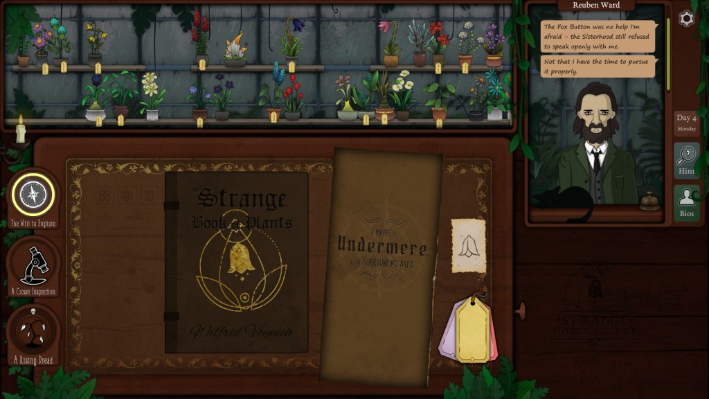 We’re talking today about Strange Horticulture, a 2022 puzzle game from indie developers Bad Viking. Strange Horticulture takes the basic mechanic of Papers, Please and translates it into the context of – I guess a Victorian herbalist? People come in with maladies, and you have to help them out with the right plant. Some plants help people sleep. Some are good for stomach pain. Some will kill you. People walk in your shop and tell you their problems, and you have to flip through a little notebook and figure out which plant might be good for them. Your knowledge, unfortunately, is incomplete. At the start of the game, your handful of plants have no labels. You’ve inherited a notebook, but it’s mostly empty. You have to research the different plants, collecting scraps from textbooks and other knowledgeable people. Some people will also bring you different plants that they find out in the mountains or down the back of their bins – and it’s your job to try and identify them, to try and figure out what they are and what they might do. There’s also some occult stuff and an evil ritual – you know, the usual.
