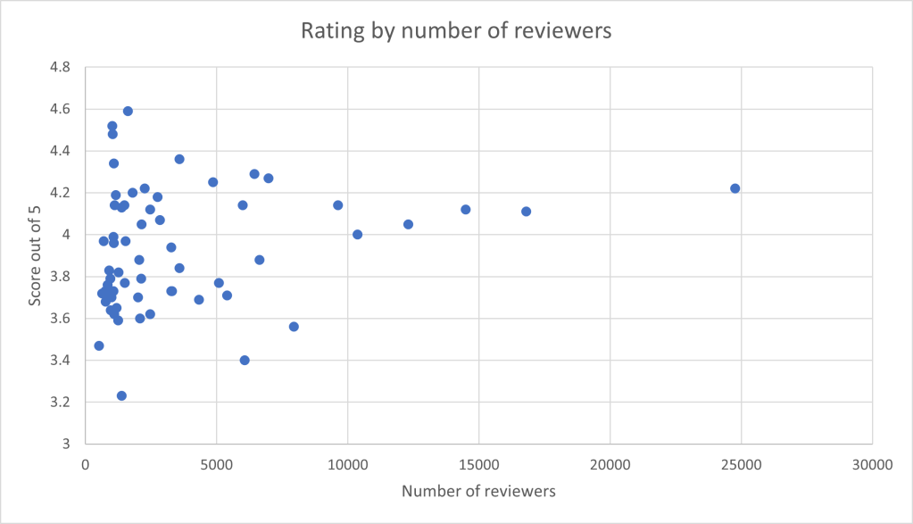 In saying that, we should reiterate all the various issues and complexity making up those figures. For example, the number of ratings drops off rapidly over time. The first book, Horus Rising, has been rated 25,000 times. Books 2 through 5 sit around ten to fifteen thousand ratings, and then things drop away even further. Five thousand, two thousand, nine hundred – interest clearly declines. That’s important for how we interpret these numbers. Fewer readers means that each individual rating carries more weight. There’s also an averaging effect that happens with larger numbers of readers. You can see it below: as the number of reviewers goes up, scores tend towards a center of 4 stars. The highest and lowest average scores go to titles with fewer reviewers. There’s some intuitive sense there: niche titles might be better loved by a smaller audience, or they might be unpopular, leading to the lower ratings. In either case, you can’t just take the scores at face value. As the number of reviewers goes up, different drivers come into play.