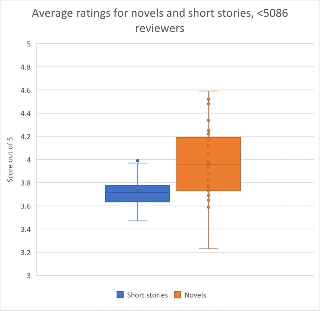 Our data set for this analysis will be drawn from scores from Goodreads – which, you know, is already a bit of a red flag. We could spend a long time discussing the problems with that platform. We could talk about the problems with score averaging, or with the social and performative aspects of rating books publicly, or we could ask whether readers on Goodreads accurately represent the feelings of the wider community of readers. We could do those things, but we’re not going to. We’ll just acknowledge the issues and see what we can make of the data regardless. As always, as with any sort of data analysis, use it at your own risk.