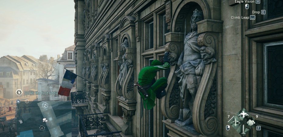 This is the reason why these games are obsessed with secret societies and mystical codes, with invisible symbols that you can only see with your Assassin’s Eagle Vision. The Assassin’s Creed games, and Unity in particular, are fixated on reconnecting with the past, with drawing out lost knowledge and seeing things that otherwise go unseen. I think that’s something we can relate to. There is a history out there, and it’s a history that many of us have simply and straightforwardly lost. Assassin’s Creed, in all its hackneyed, half-assed faux-historicism, taps into that instinct. It presents the out-there, the heritage in the past that we feel we’ve lost track of, and it gives us ways to decode it, or to feel like we’re decoding it. We know that iconic and important landmarks carry symbolic meaning. We feel that they’re speaking to us. Unity affirms that impulse. It gives us a way to hear them, to read them, to navigate across them. It draws attention to the nuances of their material form, weaving the built environment into the key themes of freedom and control. It’s easy to move around in this game, sure – that’s part of the metaphor. If Assassin’s Creed is a power fantasy, it’s specifically a fantasy about the ease with which we can reach back and make sense of the past. The ease with which we move around the environment is indicative of the ease with which we are meant to craft our new understanding of history. It’s glib, yes, superficial, skating across the surface rather than diving in deep. That’s part of how Unity builds up in its players the confidence to take hold of its narrative.