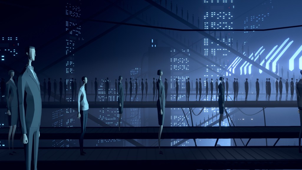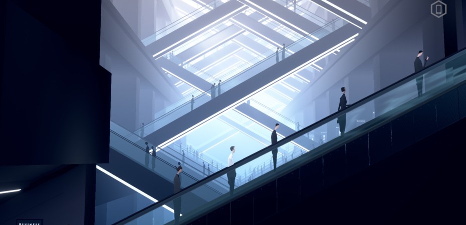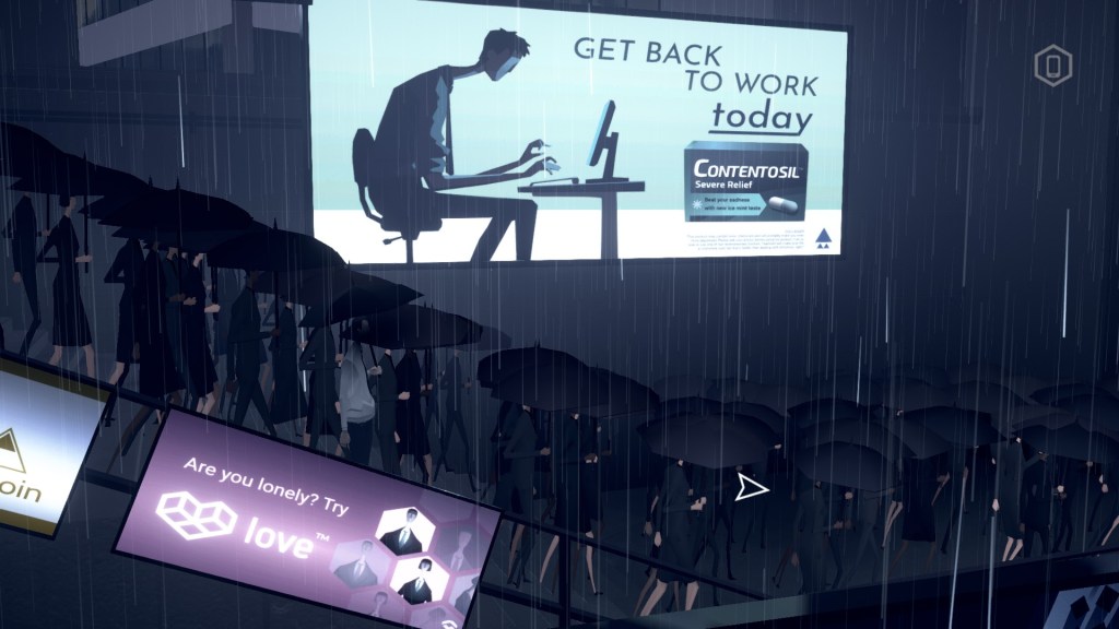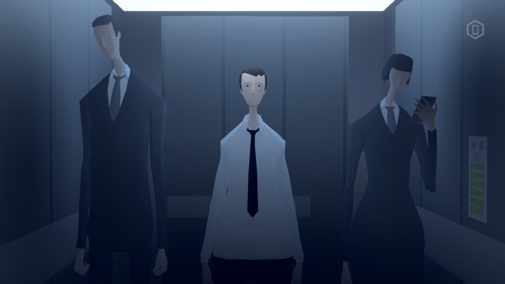 That’s the first reading, anyway. That’s the straightforward option. Mosaic is a game about how the corporate machine sucks. It’s a game about pulling the plug, about tearing yourself out of the economic machine. At the same time, there are points where you wonder – is this protagonist a bit whiny? Are things really all that bad, or is he having a bit of a sulk? There’s a question, I think, as to whether Mosaic fully endorses its surface critique of capitalism, or whether the problem is exaggerated through the lens of the miserable main character. We see hints of that exaggeration in how our nameless protagonist relates to other people. At the start of each day, the protagonist takes the lift in his apartment down to the ground floor. He always shares the ride with the same two people, pictured above. If you turn to look at either of them, they react to your gaze by looking away. Thus the dilemma: you can look sideways and have them reject you, or you can ignore them and stare straight ahead. You can reach out and experience rejection, or give up on trying to connect and rot in your isolation, stuck in physical proximity to people who couldn’t be further away. It’s presented as a critique, but also – like, don’t stare at people in the elevator. It’s okay to feel isolated, but are we really trying to solve the problem with forced elevator eye contact?