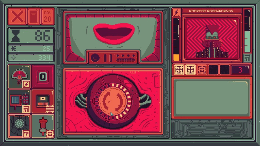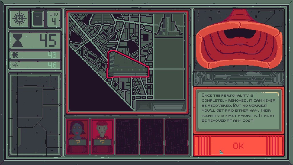 That sense of being disrupted or bent out of shape fits with the core gameplay loop of curing mental illness. You play a Mind Scanner, a member of the city administration (the ‘Structure’) tasked with diagnosing and treating so-called “anomalous citizens”. You’re given a list of subjects each day, and you have to fly around the city treating them through a series of minigames that change depending on each person’s particular disorder. The gameplay challenge is to balance your time against safe, successful cures. Like Papers, Please, you’re charged a daily fee for living costs. You get paid by curing people, which you can do with varying levels of care. If you’re short on cash, you can brutalise someone and get a quick payout. You essentially rip their personality out of their body, leaving behind a shambling shell. Thus the razor’s edge: you’re hounded by the financial demands of an uncaring system, working to treat patients with care without sacrificing your own livelihood. If you’re slow, you’ll get evicted. If you make mistakes, you’ll stress the patient and they’ll stop working with you. If you don’t take steps to protect their personality, they’ll end up functionally lobotomised. Also, the revolution wants your help to overthrow the government.