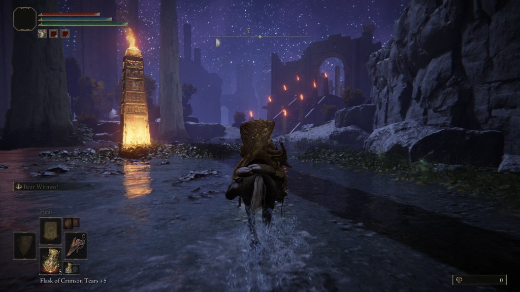 I wouldn’t be able to write it, though – I don’t like writing like that. If I’m talking about a game, I like to be sure that I know what’s in it. If I’m still stumbling into new cave systems after 250 hours (over six working weeks of game time), I don’t think I’ll ever have a good enough grasp to talk about it in full. Part of the difficulty is in how Elden Ring (and the Dark Souls games more broadly) construct their narrative. Take Siofra River, one area in Elden Ring. It’s deep underground, and the sky down there (really the roof of the cavern) is deep purple and studded with stars. Most areas in this game have some sort of climactic boss fight. They aren’t linear per se, but they often follow the traditional video game structure of a gamut of enemies culminating in some form of final boss. Godrick the Grafted sits at the end of Stormveil Castle. He marks the end point, guarding the exit out into Liurnia of the Lakes. Siofra River has a slightly different structure. It’s a corridor level – you can enter from Mistwood and leave up towards Caelid, and the boss is optional on the side. There’s a temple off somewhere with the carcass of a giant antlered stag – if you light a bunch of braziers scattered around, the stag begins to glow, and if you touch it, you’re teleported to a boss fight against the Ancestor Spirit, a happy hopping version of the stag that breathes fire at you. Descriptively, experientially, that’s what happens. You can go from Mistwood to Caelid, or you can light some fires and kill a giant deer. You might also be tempted to ask – what’s that about then? What’s going on here?