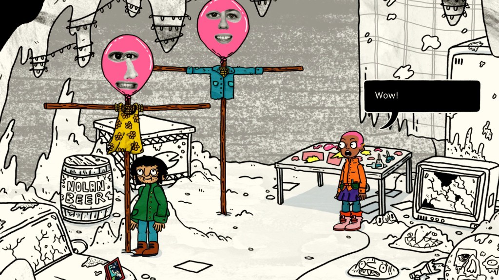 Several features of the game reinforce this pushing out. Early in the game, Anders, a weird cave-dwelling guy who’s certain that he’s dead, asks you to help him build his parents. You’re presented with a balloon and a bunch of real human features – eyes and mouths, noses. You paste together faces to look like his mother and father, Mr Potato Head-style, and they sit on scarecrow frames in his cave for the rest of the game. The visual style obviously doesn’t match up: these are black and white photographed human features pasted into this hand-drawn game. The real world constantly bursts into the game. Anders has a picture of a real dog sitting on his broken car. There’s a real guy’s face on the ‘out of order’ sign on the pinball machine (possibly one of the developers?), and each act ends with a recording of a real person telling the real story that inspired the events of that day. They’re all family members of the game’s director: her mother, father, and brother. In a manor on the hill, there’s an audio recording of the developers discussing their design intentions for one of the early sequences, and at the end of the game, you leave the virtual environment altogether and get a filmed walkthrough of the developers’ work space, with all the various members of the dev team waving and welcoming you into the real world.