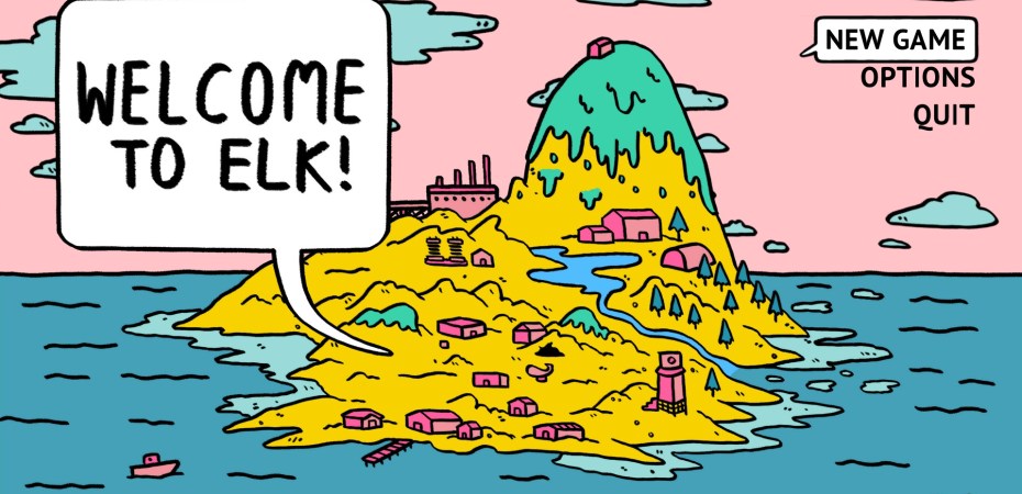 Welcome to Elk is a 2020 game by Triple Topping, a Denmark indie development studio that is now sadly closed. It’s a weird little narrative game where you go to an island and meet a bunch of locals, in the vein of Mutazione or ‘returning home’ narratives like Night in the Woods or Lake. Graphically, it’s quite stark. It’s presented in a hand-drawn style, almost like one of those hidden object games. Straight lines aren’t perfectly straight: they look as if they’re drawn with a free hand, with curves and imperfections. There are pockmarks and blemishes across most surfaces, which give a sense of texture, but which also speak to the drawn line of the pen. For the most part, the game is presented in black and white. If something’s interactive, it’s given in colour – and the colours are often acid-washed variations. The wood in the carpenter’s studio isn’t brown, it’s pink. The fireplace in the home of Frigg, the main character, is an acidic green on green. Frigg’s fridge is yellow and pink, and the frame of her front door is light blue. It’s this slightly psychedelic colouring, all cast against a black and white background that looks like a blank illustration in a colouring book. The animation style is similarly bizarre. Characters move as if they’re being puppeteered – there’s nothing smooth or organic about it. It’s almost QWOP movement. Limbs rotate around circular joints at elbow and knee. Walking is a jumble of spinning tubes, more like cycling than footsteps. It’s not crude, because crude implies a certain roughness of technique. It’s artificial. It’s illustrated, weirdly coloured, puppeteered. It’s not blunt – it’s often quite delicate – but it’s also clearly not in any sense realistic.