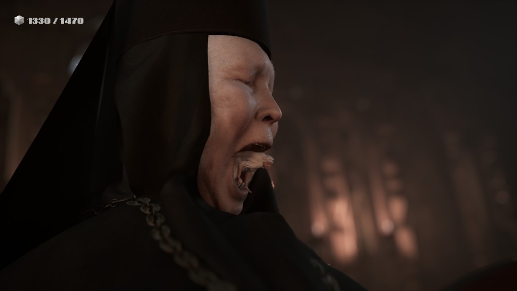 The game similarly moves back and forth between the modern day, represented in this closely rendered triple-A environment, and a pixelated 8-bit past. The past in this game is idealised, fed through the lens of nostalgia (much like its 8-bit graphics). It’s simpler, more pure. It carries intimations of lost innocence. One aspect that appears carried over into the modern day is the coin counter, present in the top-left corner throughout the game. If you complete tasks or pray to icons, you get giant pixellated coins, obviously at odds with the smooth, lifelike graphics of the world. Collect enough coins and you can level up. You can choose between different stats that really (on reflection) only increase the speed at which you gain additional levels. The pointless acquisition of coins is part of the game’s vision of religion – “Useless labour is the basis of spiritual development”, as the narrator (the devil) observes. The coins are a relic of an idealised past that, like all idealised forms, is false. This is where we loop back to D&D. INDIKA tells you early on that collecting coins is a useless labour. It tells you that there’s no point. And yet the close identification between game mechanic and story encourages you to soldier on regardless. Just as shooting the bad guys in Borderlands is both gameplay and narrative event, collecting coins is part of the narrative. Engaging with the game mechanics is playing out the story. If we weren’t meant to do it, why would it be in the game?