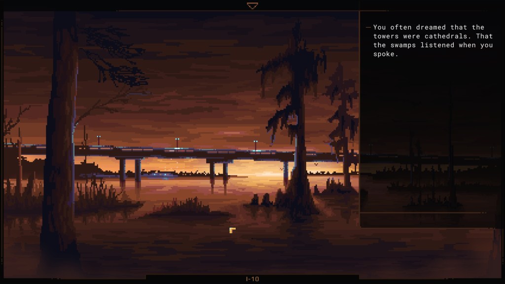 This is what I mean by awe – the scope of vision in this game, the complex language that sees religion and technology as merging forces, bending towards the same single point of self-destruction – two distractions from capitalism and the underlying ecological crisis. None of these forces are necessarily wrong or evil – aliens are real, and so is Superduck, and Pawpaw the Ditch Man might have actually heard from Mary Magdalene after all. When you go under the water in the bayou, you see impossible things. You swim through the window of a sunken house “and discover that there is no water beyond it.” Looking outside, “you watch as willow trees floating along the bank of the bayou leave the earth entirely, sucked into an insatiable purple sky.” There is a magic here, something unnatural, or supernatural, or from another world. There’s something magic happening in the bayou. “The lake and all of its sediment is infinite in its silence.” There is an insufficiency to our language and understanding. Shield digs away at the oil, and the poisoned, impoverished locals turn to their different solutions, and it’s all wrong, but through all of it, something – something – beats in the heart of the swamp. There’s still something out there, NORCO says. In the city, a planner speaks to Catherine shortly before her death. “But the stubbornness of nature is unmatched,” he says. “It drives the rest. In the end it drives our decisions. It forces them, you see?” You see?
