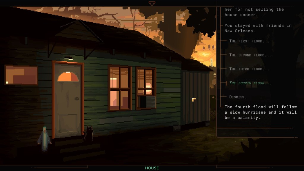 The game NORCO takes that history and spins it off into an imagined future, using the veil of fictionality to accentuate contemporary problems. Shell Oil is replaced by Shield, an oil company that “hid[es] the stars behind halogen and flame projected onto the sky every night.” Players move along the shore of Lake Pontchartrain, above New Orleans, with landmarks like the I-10 Highrise Bridge (pictured in the first image above) visible in the background. LeBlanc, a local detective, tells you about the bridge’s history, and its role in destroying local wetlands: “Then you got the Interstate Canal. The government built that to build Interstate 10. They let a whole lot of salt water into the swamp in the process. Killed off a lot of the trees.” There are even references to flooding events that link the town with Hurricane Katrina (“Three times this house has flooded.”) The destructive flooding is connected to the refinery through the association of fossil fuels and climate disaster. It speaks to a natural world disturbed, in turmoil. The destruction visited upon the town is only the destruction visited upon the broader environment. NORCO uses this reflection to link past and future, exploring Kay’s experience in the three floods in the past before presenting an option to learn about a fourth flood, which is yet to happen:
