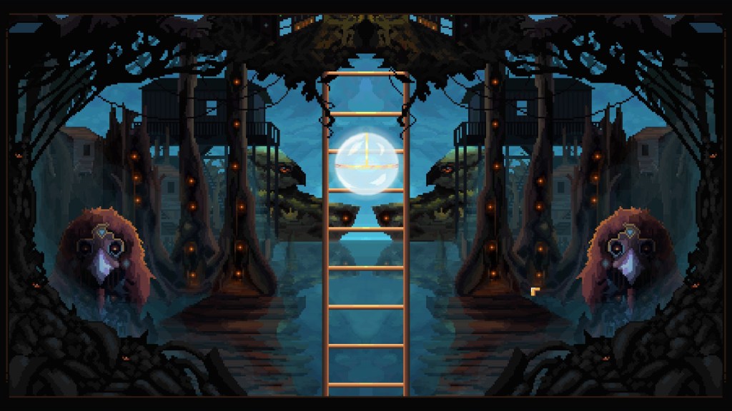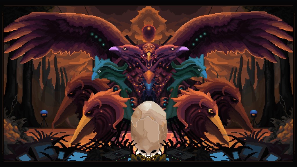 NORCO reserves a special hostility for digital technology. The “mall nazis” use augmented reality to spread bits of their gospel message around the town, and Catherine and Duck both use an experimental memory-storage technology, allowing them to store (and wipe) memories. As noted, memory in NORCO is sort of the basic operation of being human. It’s what distinguishes people in this game from factories and corporations. Catherine and Duck both outsource that responsibility to a machine, abandoning their intrinsic human burden to a computer. That technology in turn spawns the bizarre creatures that haunt the game. Superduck, a version of Duck’s memory that escapes into the internet, taps into the gig economy, hiring people to do odd jobs and collect trinkets. It’s – honestly, things get a little murky around here. Stuff starts to get weird. Technology and religion become part of the same hysteria, two expressions of the same form. There’s a priest that’s also a drone (“they’ll never decommission the drone priest, baby”), Superduck wants to capture an alien artefact, and the mall nazis build a spaceship to escape the planet, urged on by the same alien device. As you get onto the spaceship in search of your brother, the environment itself becomes syncretic – a combination of disparate features taken from incompatible sources. Aspects of the world are recast in an overtly symbolic way – they become icons, arranged symmetrically as if to communicate some sort of cryptic message. It’s set in the style of religious iconography but it’s all aliens and Superduck and the bayou. It’s electric LEDs and clouds and oil and the moon: “Metal-halide probing the river’s expanse. Coded patterns of warm sodium and cold LEDs winking, thinking, knowing.” Religion and technology whirl around each other, interweaving and recombining into some new hybrid form, some new genetic strain.